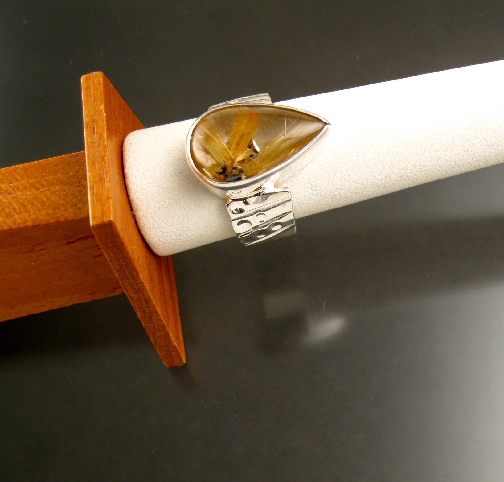 Rutilated Quartz Sterling Silver wide tapered Bars and craters band large pear shaped stone ring size 7
