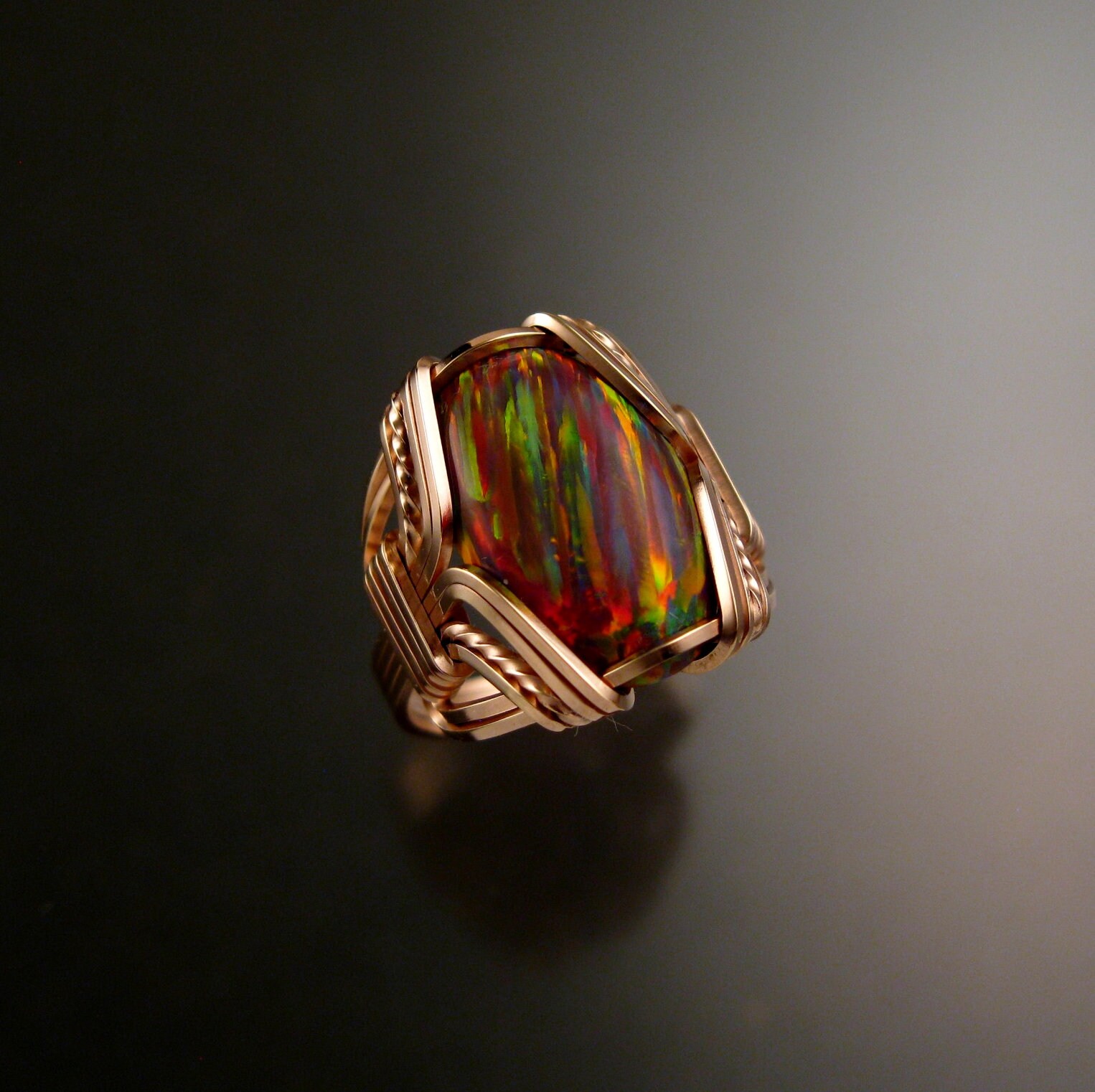 Orange Lab created Opal ring is alive with red, yellow and green fire. Handcrafted using 14k rose gold-filled square wire.Leave a "note to seller" at check out with your ring size.